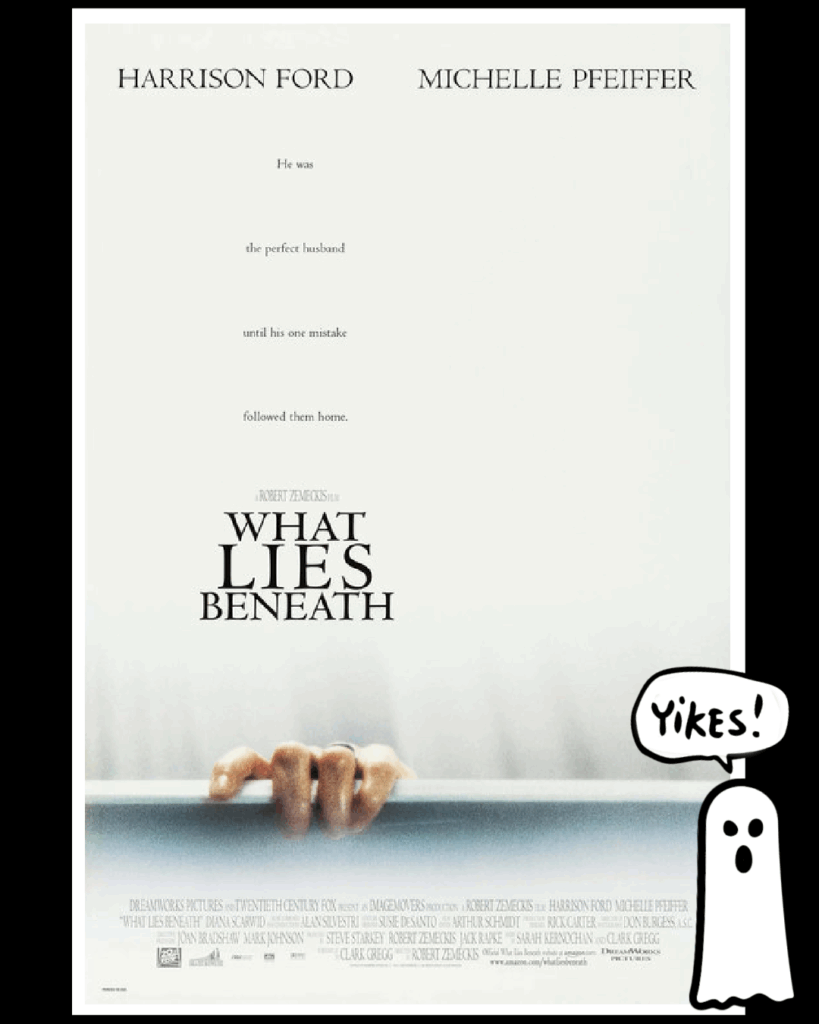 At this point I feel it imperative to reassert the fact that my favourite genre of film is the RomCom. An affinity that, while on full display in my first feature, is nowhere to be found in this list. I note it now so you’ll know I went into this next film with high hopes that I – at the very least – could relish in the ‘romantic’ side of the movie. I mean it stars Harrison Ford and Michelle Pfeiffer, but – without giving away too much of the plot – WHAT LIES BENEATH drowned those hopes in pretty fast order. I guess forgoing Ford and Pfeiffer on the movie poster should have prepared me for more nightmare than dreamy and yet – I was nowhere near ready for what came at me in this twisty flick. You see, Ford plays a University Research Scientist named Norman Spencer who’s wife Claire, played by Phieffer, starts to feel a ‘presence’ in their home, and that haunting escalates until the ghost gets its revenge.  Full transparency – I own in this movie on DVD and I jump EVERYTIME!!! Oh, it’s that good. Robert Zemeckis directs this 2000 fantasy thriller and I’m gonna tell ya it’ll keep you on the edge of your seat from start to finish. Mega award-winning composer, Alan Silvestri created the gripping score for WHAT LIES BENEATH, and Harrison Ford and Michelle Phieffer were phenomenal in their roles. No surprise to learn they were Zemeckis’ first and only choices to star in the scary feature. Oh, and here’s one more frightening fact – the beautiful house depicted in the film was used for only the day scenes and was torn down immediately after filming because it didn’t meet local building codes. The rooms were duplicated on an LA sound stage for night scenes. And get this, there were 5 versions of the bathroom set created so as to ensure the thrills were thoroughly covered from every angle. You’ll have to watch it for yourself to see why…eeeek! WHAT LIES BENEATH is available to rent/buy through apple movies.