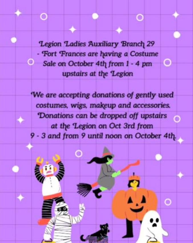 Saturday October 4th, Legion Ladies Auxiliary will be having a Costume Sale 1-4pm (upstairs)! Donations can be dropped off Friday, October 3rd 9-3pm and Saturday, Oct 4th 9-12noon.