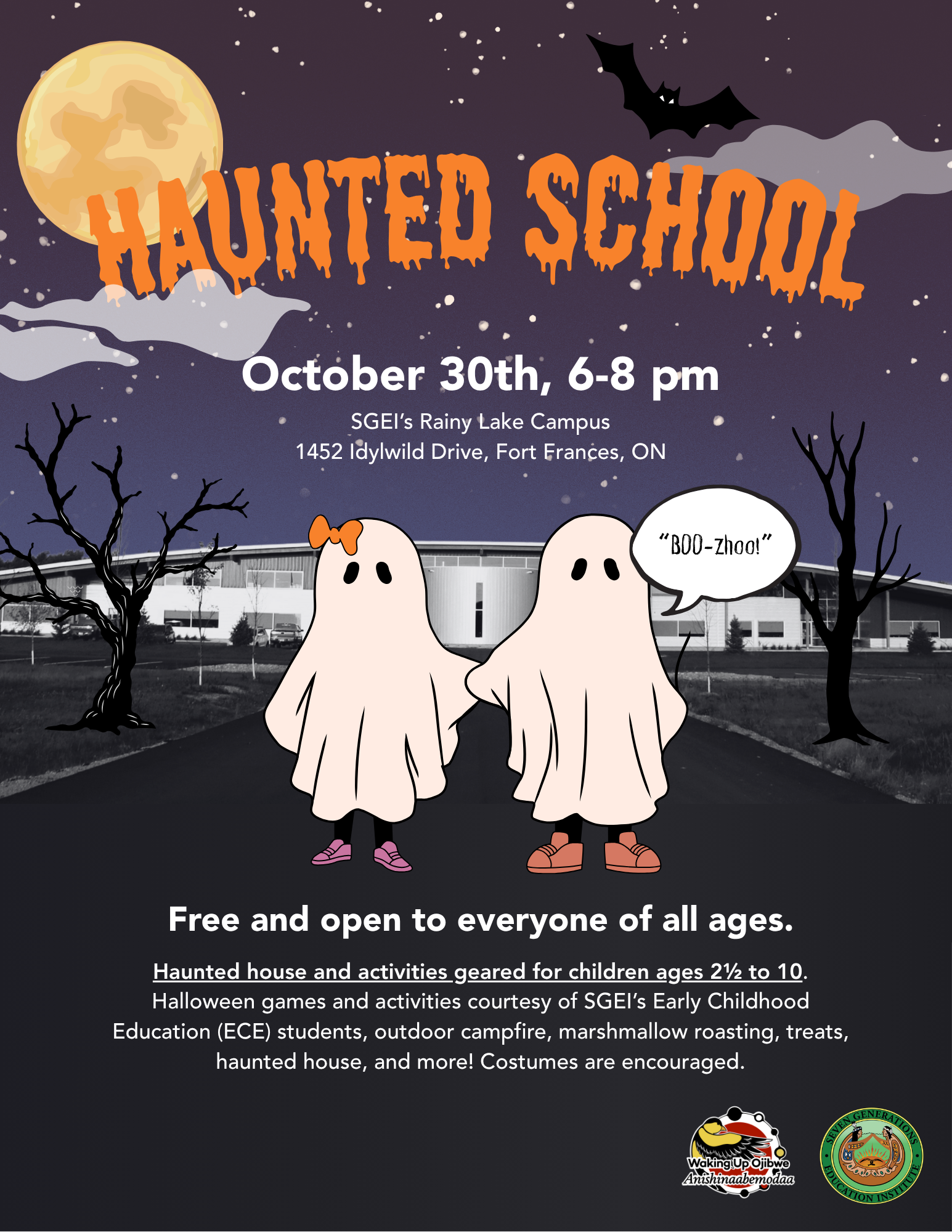 Seven Generations Education Institute (SGEI) and Anishinaabemodaa invite you and your little ones to SGEI’s Rainy Lake Campus for our spoooooooooky Haunted School! We’ll have Halloween games, an outdoor fire, marshmallow roasting, treats, a haunted house, and fun Halloween activities planned by SGEI’s own Early Childhood Education students! Haunted house and activities suited for kids ages 2½ to 10.