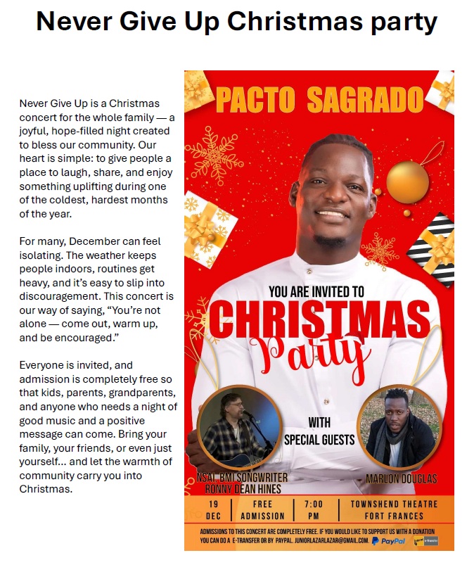 The “Never Give Up” Christmas Party is taking place on Fri Dec.19th at 7pm at the Townshend Theatre in Fort Frances