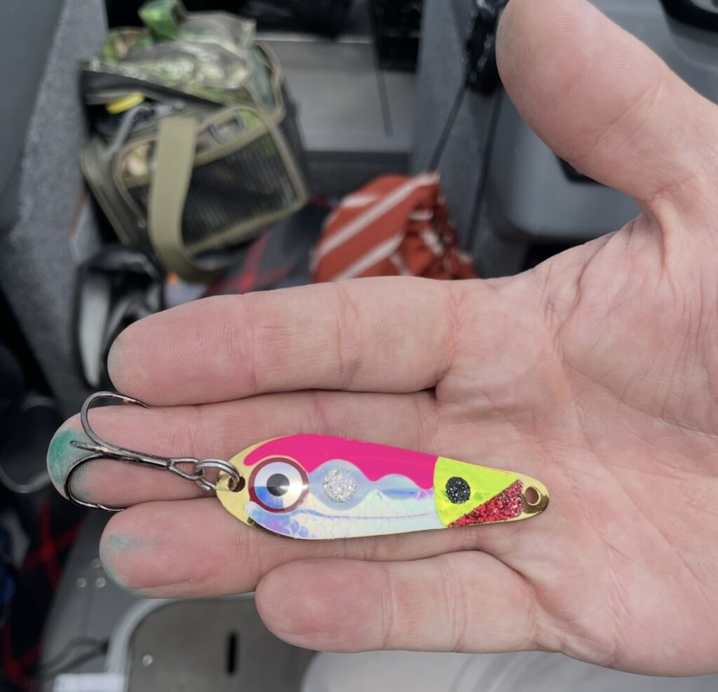However, after a while, Daniel’s lure choices and applied techniques were no longer effective. So he grabbed an unorthodox, shiny new spoon he called “pinkie,” which he had bought just prior to the trip. The spoon was not heavy, so it allowed some hang time while fluttering in a slow descent after his cast.
